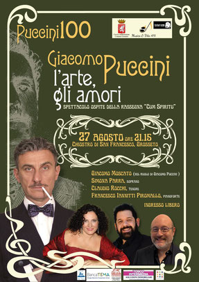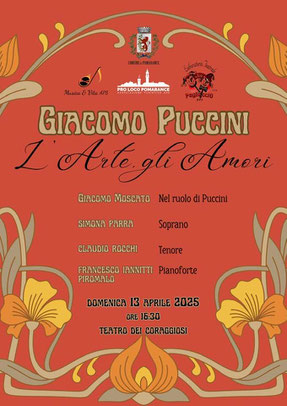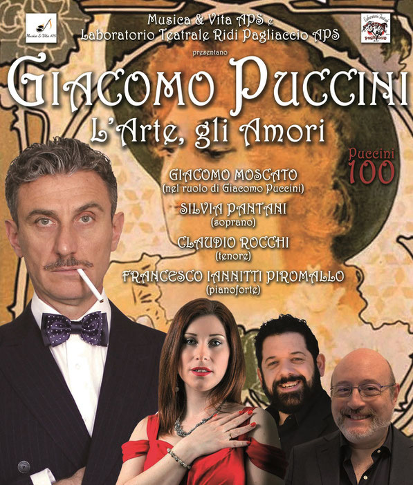 Lo spettacolo "Giacomo Puccini - L’Arte, gli Amori” nasce in occasione del centenario dalla morte del grande compositore (Bruxelles, 29 novembre 1924). L’attore Giacomo Moscato, attraverso una serie di monologhi da lui stesso scritti, interpreterà sulla scena Giacomo Puccini, che parlerà di sé, della sua vita artistico-amorosa e, in particolare, del suo travagliato rapporto con il mondo femminile. Sulla scena si alterneranno alla recitazione un soprano (Silvia Pantani) e un tenore (Claudio Rocchi), che eseguiranno alcune tra le più famose arie d'opera e duetti pucciniani. Il maestro Francesco Iannitti Piromallo li accompagnerà al pianoforte. La performance consentirà allo spettatore di conoscere episodi e aneddoti della vita del grande compositore toscano, i suoi tormenti, le gelosie della moglie Elvira, i tradimenti, gli amori, i grandi successi, la sua passione (oltre che per le donne) per la caccia e per le riunioni goliardiche con gli amici e, in fondo, la solitudine di un uomo la cui vita è stata circondata da tanto amore, ma anche attraversata da drammi e conflitti. Accanto a Puccini, dunque, come in un sogno, sulla scena appariranno Mimì e Rodolfo, Tosca e Cavaradossi, Ciò Ciò San e Pinkerton, Turandot e Calaf… Giacomo Puccini riservava un’attenzione particolare alle donne che, nella sua musica, ricoprivano sempre dei ruoli di rilievo. Nessuno ha saputo offrire alla voce femminile regalo più bello delle melodie pucciniane e così grandi personalità sceniche.